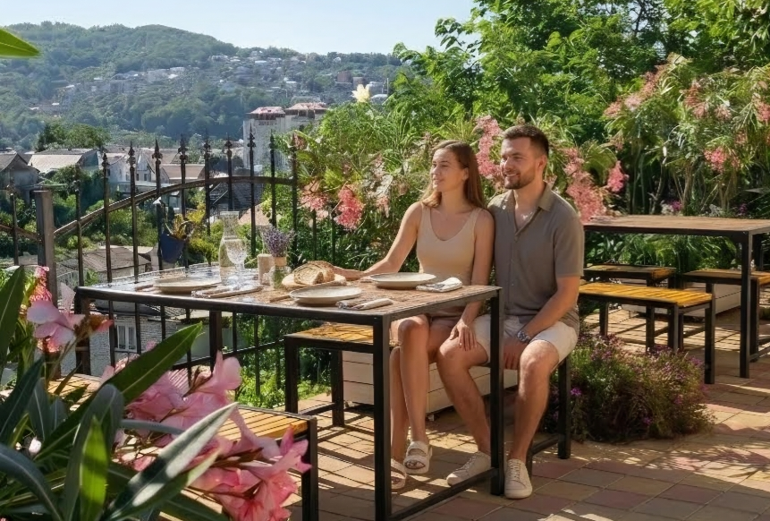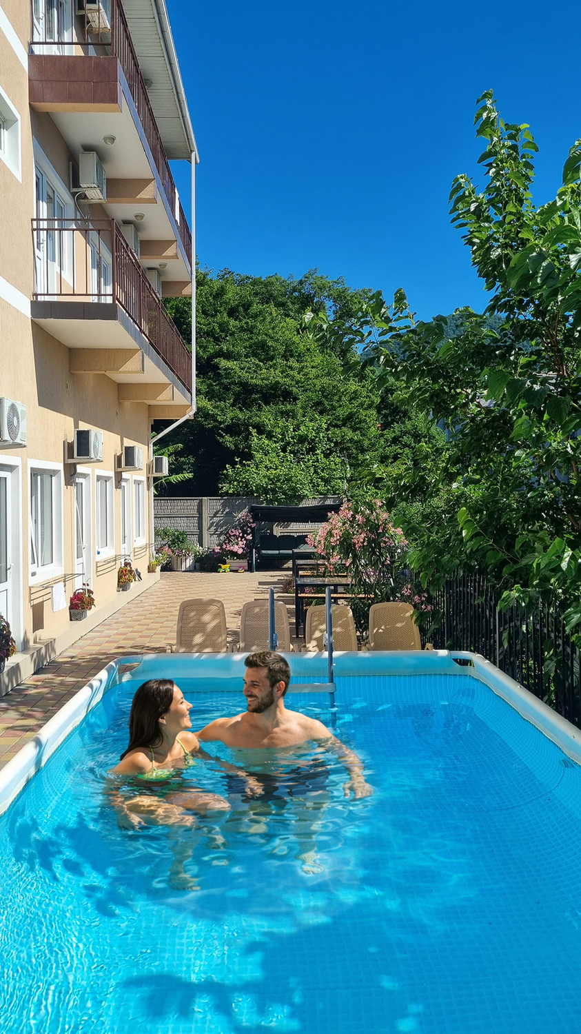 Тихий зеленый дворик, уютные номера с душевной атмосферой и вид на горы с террасы — в нашем курортном частном доме вы почувствуете, что приехали не в отель, а в гости к хорошим знакомым.